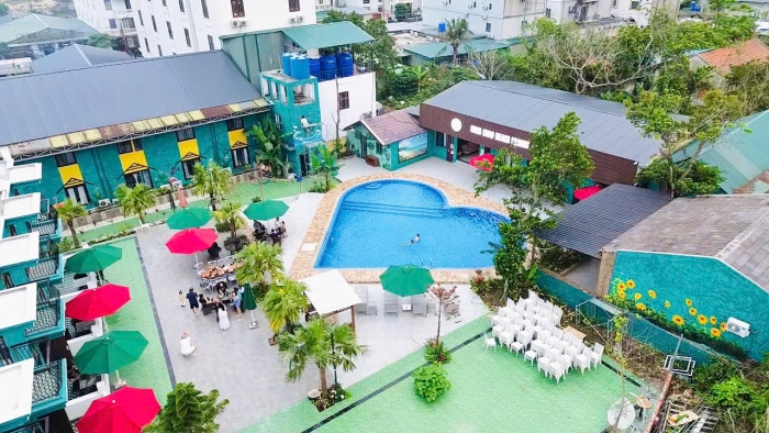 Khuôn viên resort được bao quanh bởi cây xanh, giúp tạo ra không gian trong lành, mát mẻ, lý tưởng cho các hoạt động nghỉ dưỡng